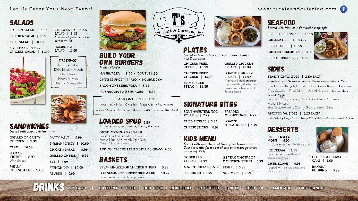 At T's Cafe And Catering Menu, you'll find a delightful mix of comfort food and creative dishes that make every meal feel like a celebration. Located in the heart of Tatum, TX, this cozy spot on 130 Hill St is known for its inviting atmosphere and delicious offerings that cater to all tastes. Whether you’re grabbing a quick bite or planning an event, T's Cafe offers everything from hearty breakfast options to savory lunch specials, and even catering for your next gathering. Each dish is crafted with care, using fresh ingredients that bring out bold flavors. You can expect friendly service and a warm, welcoming environment every time you visit.